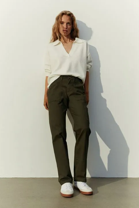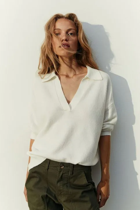 Chompa tejida en punto fino suave con cuello acanalado y escote en V. Modelo de hombros caídos con mangas tres cuartos y remate en punto acanalado en puños y bajo.